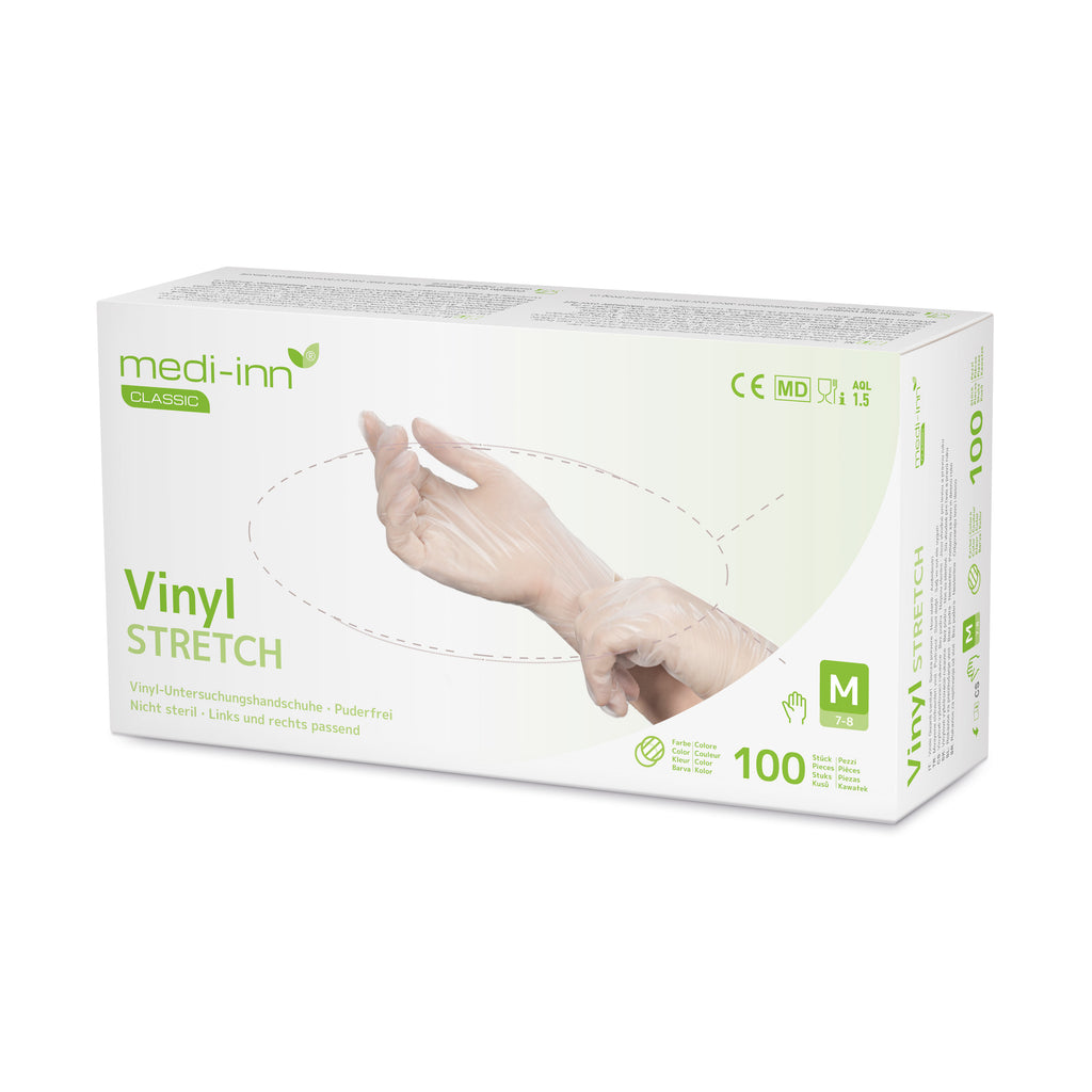 Die Medi-Inn Vinyl Stretch Einmalhandschuhe sind hochwertige, puderfreie Untersuchungshandschuhe aus elastischem Polyvinylchlorid (PVC). Sie bieten eine angenehme Passform und ein ausgezeichnetes Tastempfinden, wodurch sie sich ideal für den Einsatz in medizinischen Bereichen, der Pflege, Kosmetik sowie im Umgang mit nicht fettenden Lebensmitteln eignen.