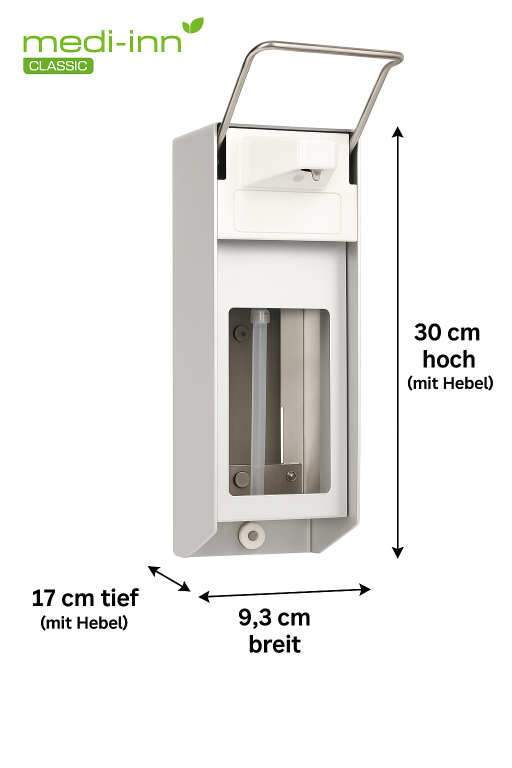 Der robuste Aluminiumspender mit kurzem Armhebel von Medi-Inn ist eine schnelle, hygienische und platzsparende Lösung, um Seife, Desinfektionsmittel und andere Flüssigkeiten zu dosieren. Es können alle der Euronorm entsprechenden 1000 ml-Gebinde angewendet werden. Der Euro-Spender von Medi-Inn ist im Handumdrehen montiert. Das Wechseln der Euro-Gebinde ist blitzschnell erledigt. Der kurze Armhebel des Spenders kann problemlos mit der Hand, dem Unterarm oder dem Ellenbogen betätigt werden.