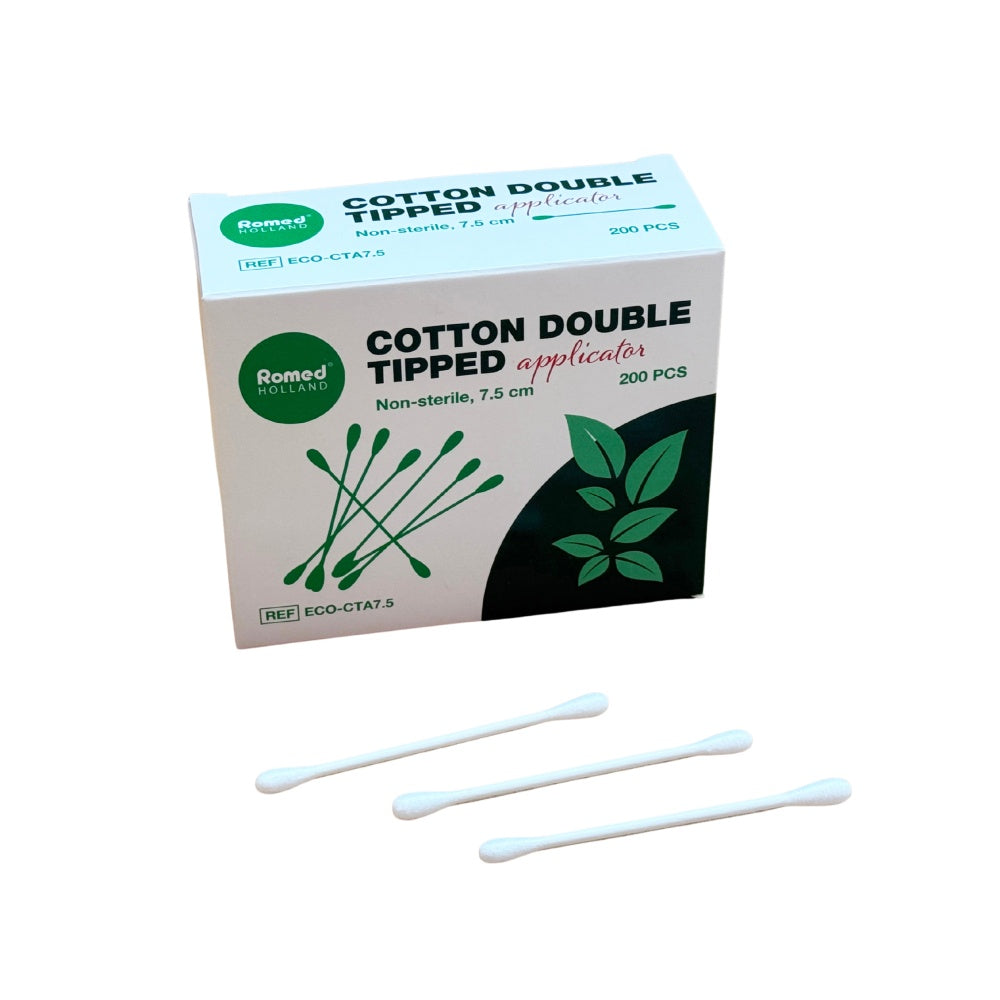 Die Romed Wattestäbchen ECO-CTA7.5 sind unsterile Pflegestäbchen mit zwei Baumwollköpfen und einem weißen Papierstab. Sie sind als Einmalprodukt für den Einsatz bei allen medizinischen Anwendungen vorgesehen.