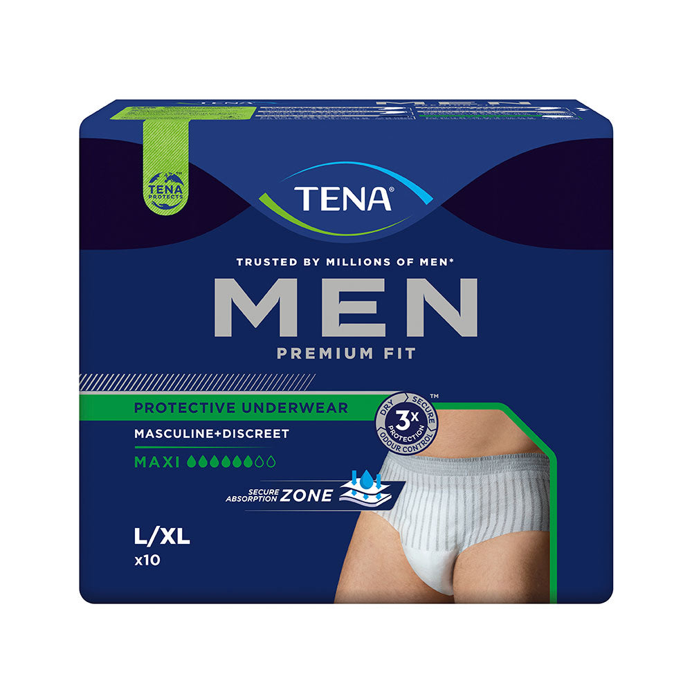 Tena Men Premium Fit Protective Underwear Maxi für Männer fühlt sich an wie normale Unterwäsche, sie hat einen maskulinen Schnitt und ein